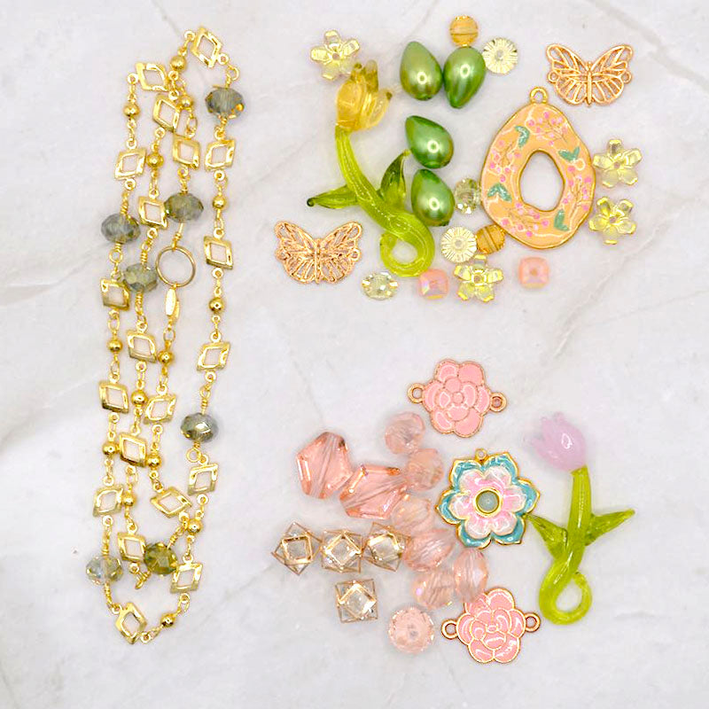 This pastel colored bead bundle features two bead mixes and a 24-inch cut of Jesse James Beads Chain Reaction Beaded Chain. Each mix features a stunning hand-blown lampwork tulip paired with stunning faceted glass, gold plated metal connectors, gold-plated metal and enamel connectors, mini caged crystal beads, and focal gold-plated metal and enamel pendant. Largest piece in bundle measures 34.5mm x 25mm x 2.5mm. Smallest piece measures approx. 6mm x 4mm.