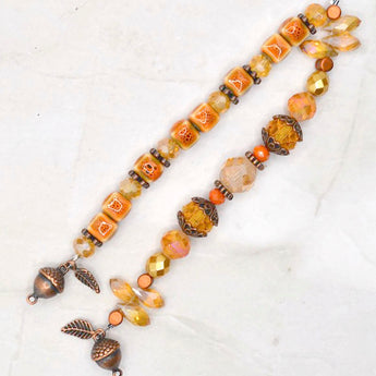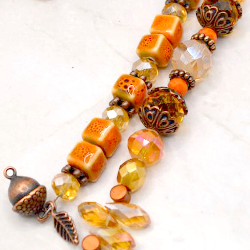 This playful nutty duo of bead strands is the perfect way to add a little spice to your next jewelry project. Each strand features a blend of faceted glass rondelles, faceted glass top-drilled teardrops, faceted glass rounds, ceramic glass cubes, copper-plated brass metal spacers, copper-plated brass metal spacers, and adorable metal acorn connectors and leaf charms. Largest piece in set measures 16.5mm x 10mm. Smallest piece measures 4mm x 6mm. Perfect for bracelets, necklaces, and more.