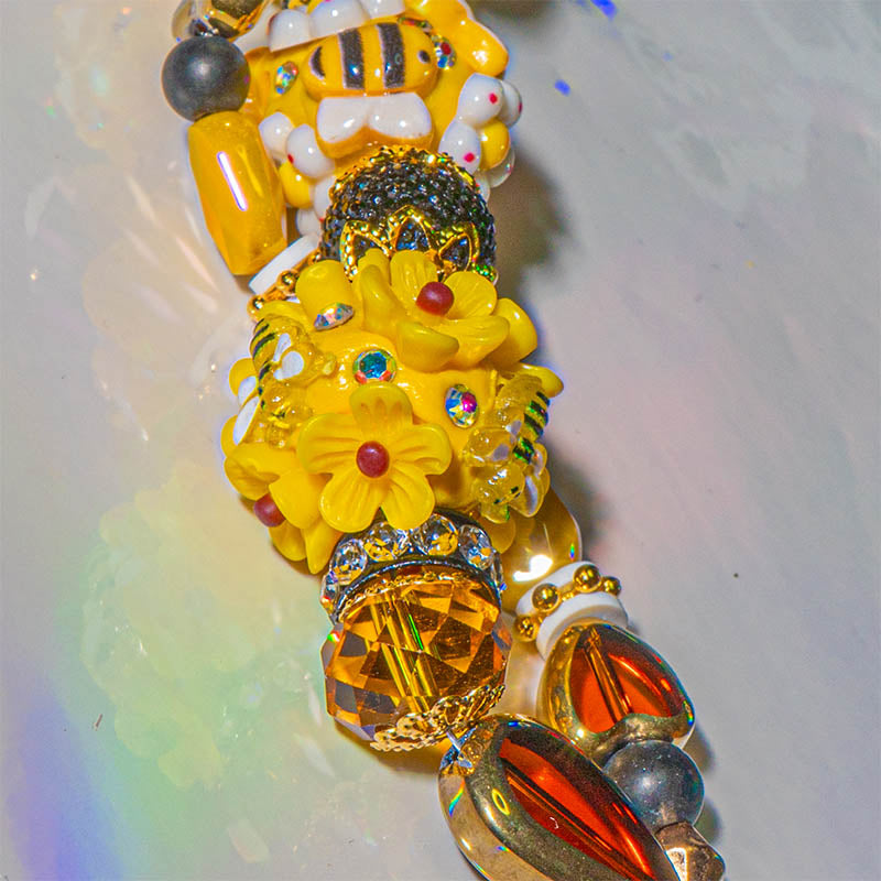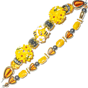 Flowers and bumble bees make up this fun and whimsical Boho Bead Strand Duo in What's The Buzz?. Three focal beads in bright yellow, adorned with adorable bees, are paired with black and yellow beads, along with smoky topaz teardrop and heart-shaped beads surrounded by shiny gold. Each 6-inch strand contains 31 pieces. Beads range in size from 4 mm to 18 mm.