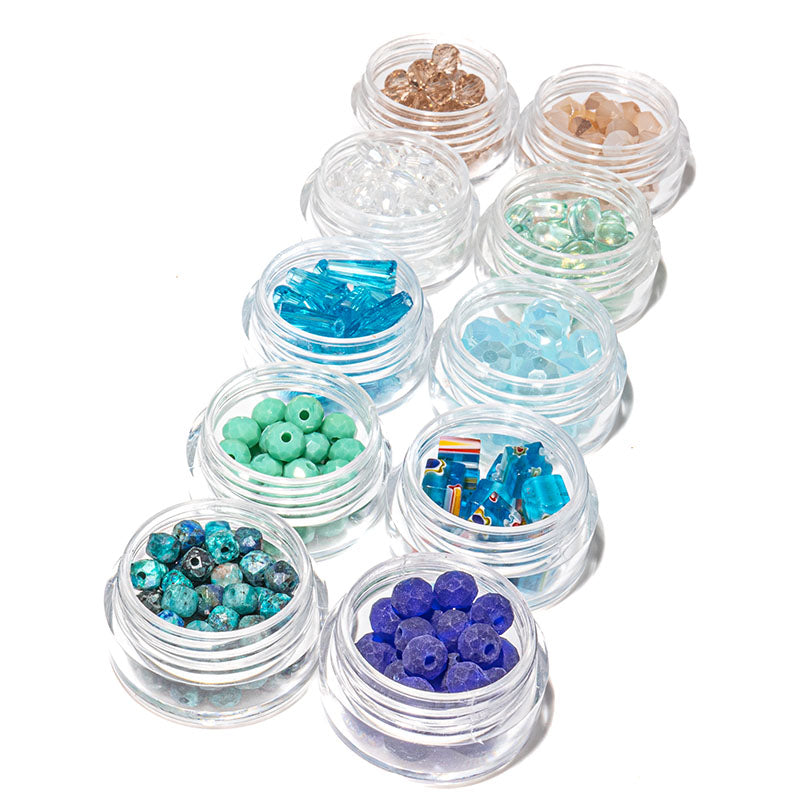 This bold beachside color palette features stunning blends of teal and neutral sandy accents. Each bundle can include a blend of faceted glass, millefiori glass beads, mini stone beads, and more. Contents may vary. These bold colors add a bright and daring look to any jewelry project. These beads are perfect for creating earrings, bracelets, and more. Each color boxes feature an assortment of 10 different bead styles, over 100 beads per box! Contents may vary, but will stay within the palette of colors. Smallest beads possible in box measures 2mm. Largest beads possible in box measure 14mm.