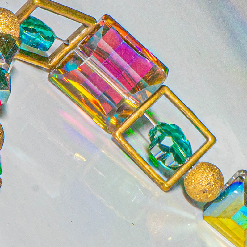 Glass Bead Strand in Jungle Party is a mix of square, hexagon, round and flower shapes in bold, iridescent colors. Each 7-inch strand features multi-faceted beads in greens, blues, purples, and accents of metal in gold, perfect to add sparkle, shine and a bit of elegance to your jewelry creations. 19 pieces per strand. Beads measure in size from 5 mm to 18 mm.