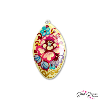 What's more charming then a pretty pink rose? This hand painted treasure features a light and feminie design in pinks, blues, and purples. Each pendant is made with love by Global Curiosity Studio. Each pendant measures 37mm x 21mm x 3mm.