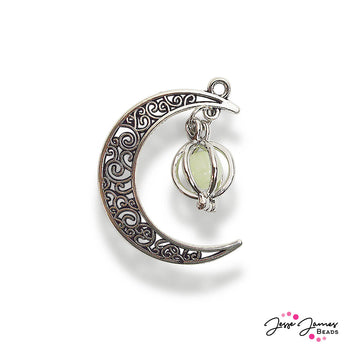 Get ready for a spooky night out with this beautiful metal pendant. This pendant features a caged glow in the dark bead dangling from the top of the moon pendant. Each pendant measures 41mm x 26.5mm x 13mm.
