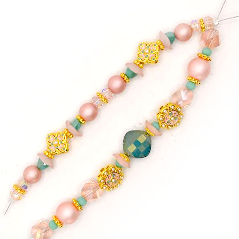 Soft, elegant, and full of charm, the Duo Bead Strand in Peony is a 5 inch double strand featuring a delicate palette of teal blue, peachy pink, and gold. This strand pairs Victorian-inspired metal enamel focal beads with acrylic petal bead caps, custom-dyed faux pearls, and sparkling glass beads. Perfect for creating romantic earrings, bracelets, or layered necklaces that exude timeless beauty. Largest bead measures 2mm. Smallest bead measures 8mm.