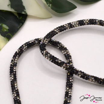 Add a dynamic touch to your designs with this gem-covered cord featuring a striking black and white striped pattern. Perfect for gluing into clasps, it allows you to create layered bracelets or necklaces that stand out with its high-contrast design. The combination of bold stripes and sparkling gems creates a sleek, modern look with a touch of elegance, making it ideal for statement jewelry pieces. Sold by the meter. Cord measures 6mm thick.