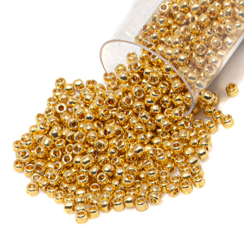Add a bold and bright touch of classic gold color with these stunning metallic gold glass beads. Perfect for pendants, bead stitching, earrings, and more! Each tube includes 10 grams of glass seed beads.