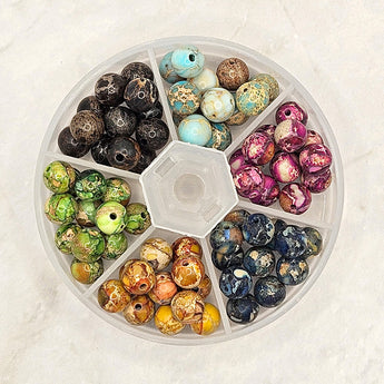 This stunning blend of natural jasper beads features 6 stunning colors, about 12 beads per color, totaling 72 natural stone beads per set. These beautiful, round Jasper beads measure 8mm with a 1.5mm hole size. Each set includes a reusable container for easy storage.