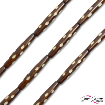 These beautiful bone beads feature long tube shapes decorated with carved polka-dot patterns. Each bead measures 36mm x 5mm. 47 beads per set