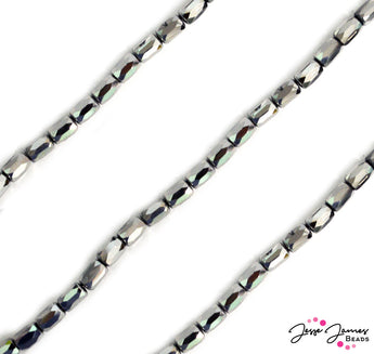 Surf's up! These silver metallic glass beads are slicker than slick. Add the ultimate flash to your jewelry projects with faceted silver glass spacer beads.. Approx 80 Beads per strand. Each bead measures 4mm x 6mm.