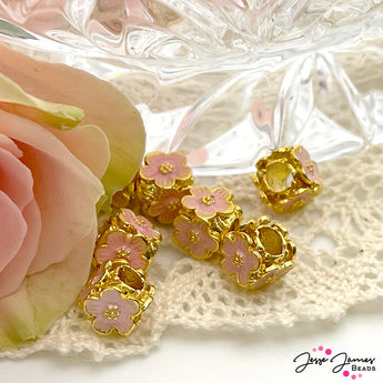 Take a stroll through the gardens with this divine bead set. Each bead is adorned with a pink floral focal surrounded by bright gold-plated metal. These floral components are ideal for your next garden party wares Beads measure 10mm. 4 beads per set