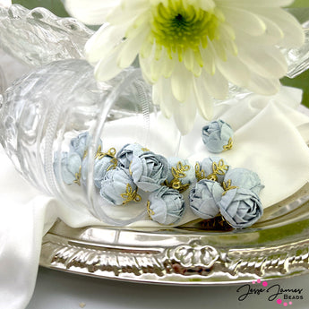 Create jewelry with an air of mystery. These light blue roses represent mystery, perfect for captivating your audience when added to jewelry creations. Each charm features a delicately folded rose perched on a bright gold-plated metal base of leaves. 2 Charms per set. Measure 15mm X 13mm.
