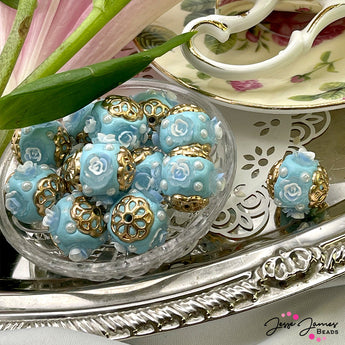 Don't be late for your appointment with the town dressmaker! This elegant fit of pearls and floral accents turns any jewelry piece into that worthy of a duchess. Each artfully crafted clay boho bead is accented with bright gold-metal plated bead caps. 2 beads per set. Boho measure 17mm.