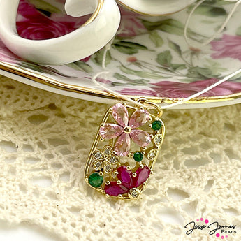 Prepare for a lovely vacation at your private Summer estate with this dazzling rhinestone pendant. This focal piece features a bright gold-plated metal base decorated with vibrant hues of pink, green, and crystal. The sparkle from this pendant is sure to turn heads when added to a necklace or bracelet. Pendant measures 22mm X 14mm X 3mm.