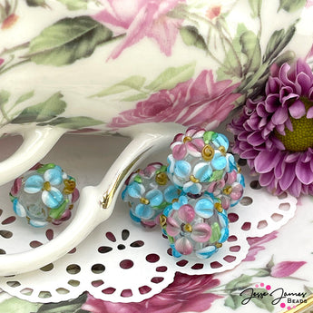 Don't sneak away to the gardens with that handsome gent yet! This beautiful lampwork style bead features a beautiful floral pattern perfect for creating garden party-worthy jewelry. Each bead features a colorful bouquet of blue and pink flowers with lush green leaf accents. 1 Bead per set. Measures 11mm.