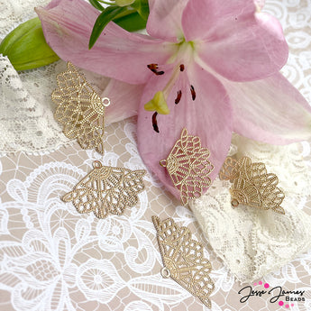 Don't get caught in the heat! These delicate alloy metal charms feature an intricate fan design. Perfect for creating earrings, bracelets, and more! No elegant lady should be caught without her own personal fan. These charms come in a set of 4, available in gold, rose gold, and silver. Each fan measures 25mm x 42mm x 0.6mm