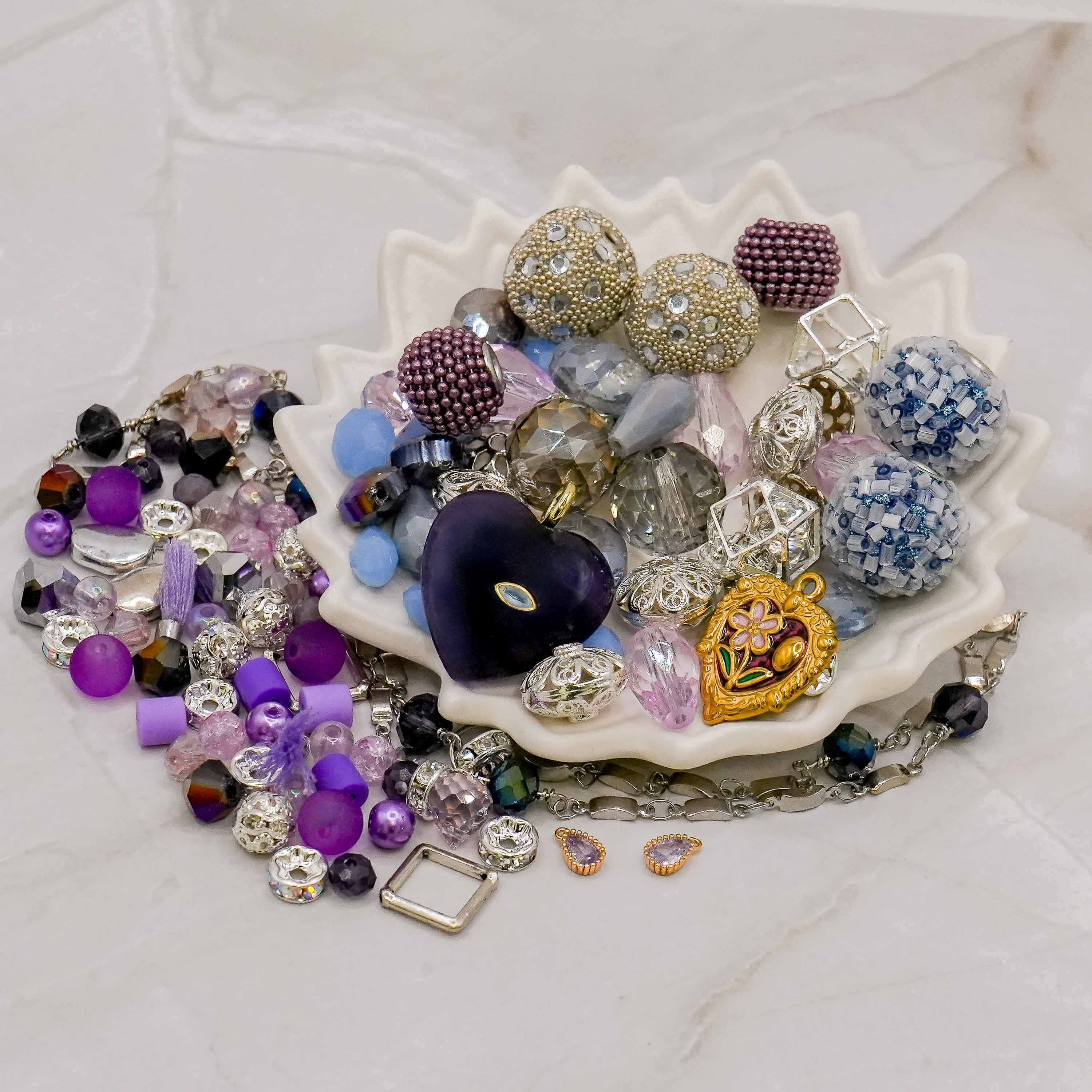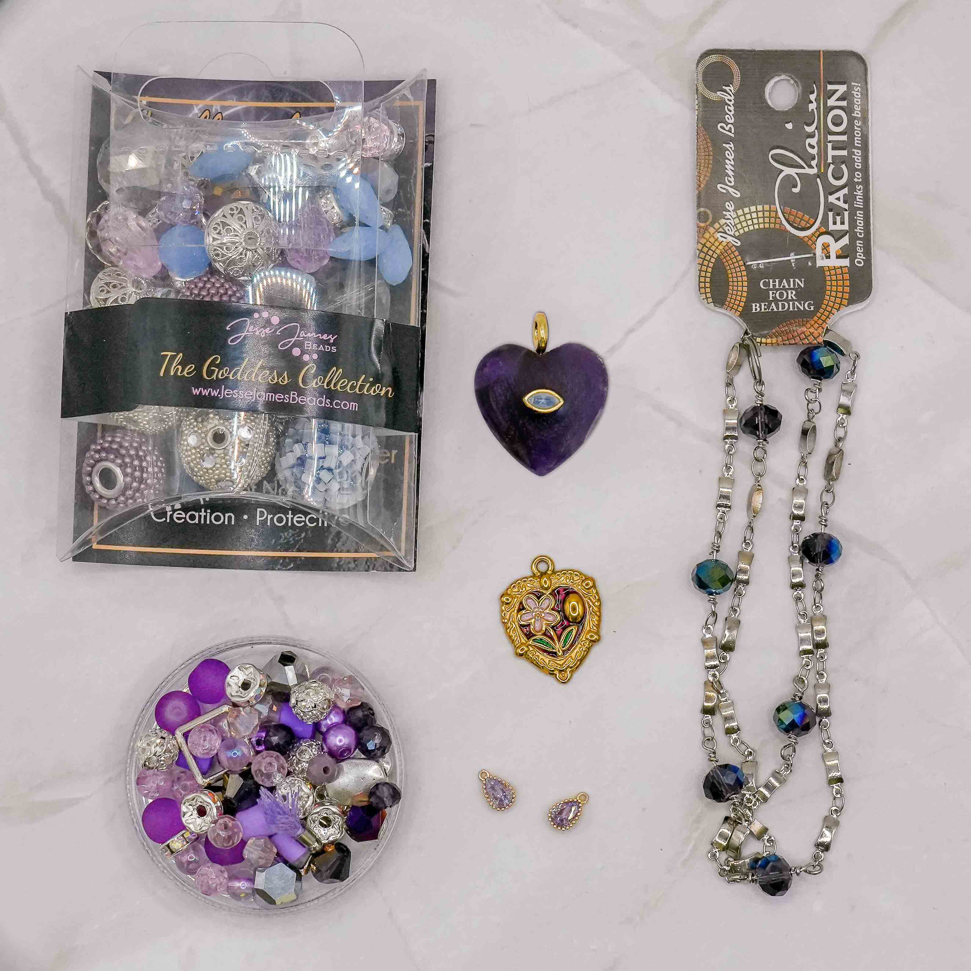 This stunning purple bead bundle features a stunning charm set including a beautiful natural Amethyst stone heart pendant. These adorable charms are accompanied by a stunning Goddess Bead Mix featuring cool purples, glass, boho beads, and more, a mini bead mix in purple, and a pre-clasped chain reaction chain. Perfect for creating cool weather jewelry or stocking up your bead stash!