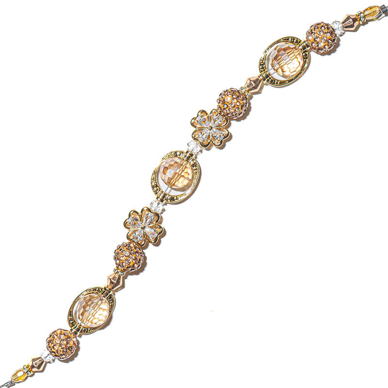 This 7-inch bead strand features a sparkling array of gold-plated brass beads. Each strand features sparkling clover beads, faceted glass, mini rhinestone encrusted boho beads, sparkling gold bicones, gold-plated bead frames, and mini faceted glass bead spacers. Largest bead on strand measures 14mm x 7mm. Smallest bead on strand measures 4mm x 2mm.