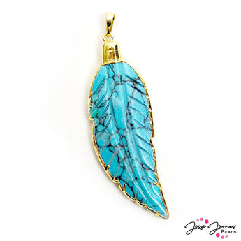 This beautiful feather carved pendant features a bright turquoise color wrapped in a gold metal frame and bail. Stone pendants may vary in size due to the stone cutting process. Colors and stone texture may also vary slightly. Pendant measures 70mm x 22mm x 7mm.
