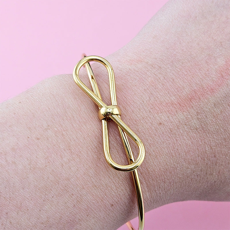 This adorable Bow bangle features a 304 Stainless Steel base adorned with a real 18K Gold plating. Waterproof and tarnish-resistant. Open Cuff Bangles Design, Real 18K Gold Plated, Inner Diameter: 2x 2-3/8 inch(5x6.15cm)