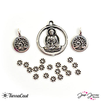 This blend of charms and matching bead spacers are all made of high quality metals from TierraCast. These metal components are the perfect touches of charm for any design project. Bright antique silver pairs well with leather, chain, cord, and more. Largest pendant in mix measures 24mm x 21mm x 3.1mm. Smallest bead in mix measures 2mm x 4mm.