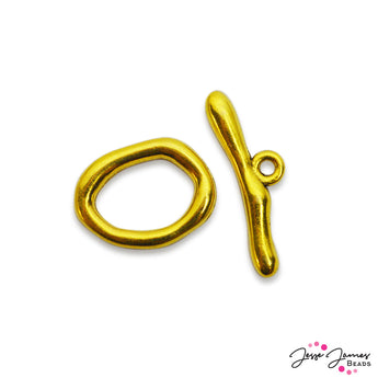 This toggle clasp features an organic round shape, giving it a more rustic look. This clasp is the perfect accenting component to your favorite golden chain, necklaces, bracelets, and more. Measurements: Ring:16x21x3mm, Bar:9x29mm, Hole: 2mm. Toggle Clasps sold in a set of 3 clasps.