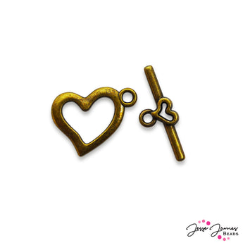 Keep your love close with this elegant heart shaped toggle clasp. This antique bronze clasp is perfect for braclet or necklace designs. Accent with accompaning beads and antique gold chain for a classic look. Toggle clasp measures; Heart: 15x19mm, hole: 1.8mm, Bar: 22x9mm, Hole: 1.8mm Toggle Clasps sold in a set of 3 clasps.