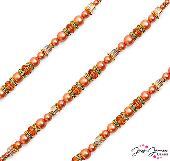 This playful peachy hue offers a fruity touch to any design project. Each strand includes custom dyed pearl beads with matching faceted glass, custom dyed heishis, and metal spacers. Largest bead on strand measures 10mm. Smallest bead on strand measures 6mm x 1mm. Please note, some pearls may have a speckled look due to custom dying. Pearls are glass and vegan friendly.