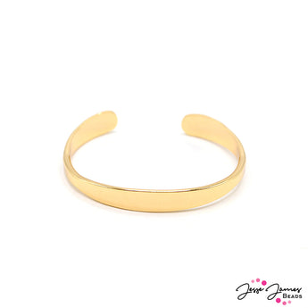 These bright gold-plated metal bangles are the perfect jumping off point for cuff designs. This flat surface is perfect for creating wire-wrapped accents. Bracelets can be bent to adjust to different wrist sizes. TIP: Warm metal in hands before bending for easy converting to different sizes. Bracelets measure 6mm tall at the thickest point. Bangles are made to fit adult sized wrists, may be too large for children.