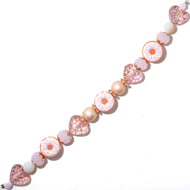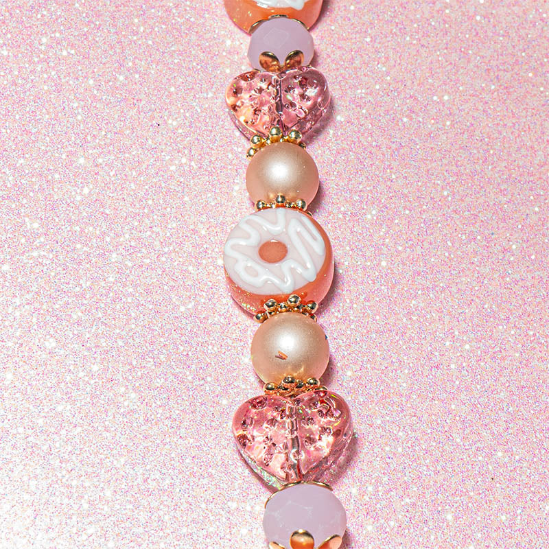 The Way to My Heart Is Donuts Bead Strand is a sweet pink-and-white delight featuring three acrylic donut beads with pink frosting and white drizzle details. Accented with pink glass hearts, custom-dyed faux pearls, pink milky rondelles, and gold bead caps and spacers, this strand is perfect for playful, love-filled jewelry designs. 28 pieces per strand. Beads range in size from 5mm to 15mm.