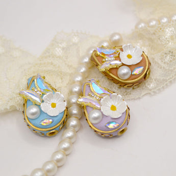 This enchanting teardrop-shaped clay bead is adorned with delicate butterflies, daisies, and shimmering faux pearls, capturing the magic of a fairy-tale garden. Its whimsical design and soft, romantic details make it the perfect addition to bracelets, necklaces, or earrings, infusing a coquette-inspired charm into any creation. Measures 26mm X 18mm. One per order.