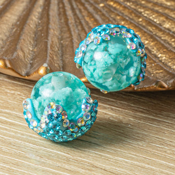 Enjoy a new twist on this classic candy flavor! This sweet candy-inspired boho bead features a whimsical clouded base adorned with a splash of sparkling rhinestones. Center of boho bead is a thick glass while the rhinestones are adorned in a layer of clay. Sold in pairs. Beads measure approx. 19mm each. Perfect for pendants, earrings, bracelets, and more.