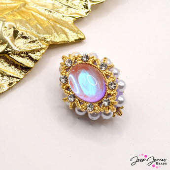 This large focal boho bead feature a bold opalesque focal surrounded by gold-plated metal snowflake-inspired accents. Each focal bead is adorned with rhinstones and mini pearls for added razzle and dazzle. Each bead measures 33mm x 25mm x 22mm. Hole size 1.5mm.