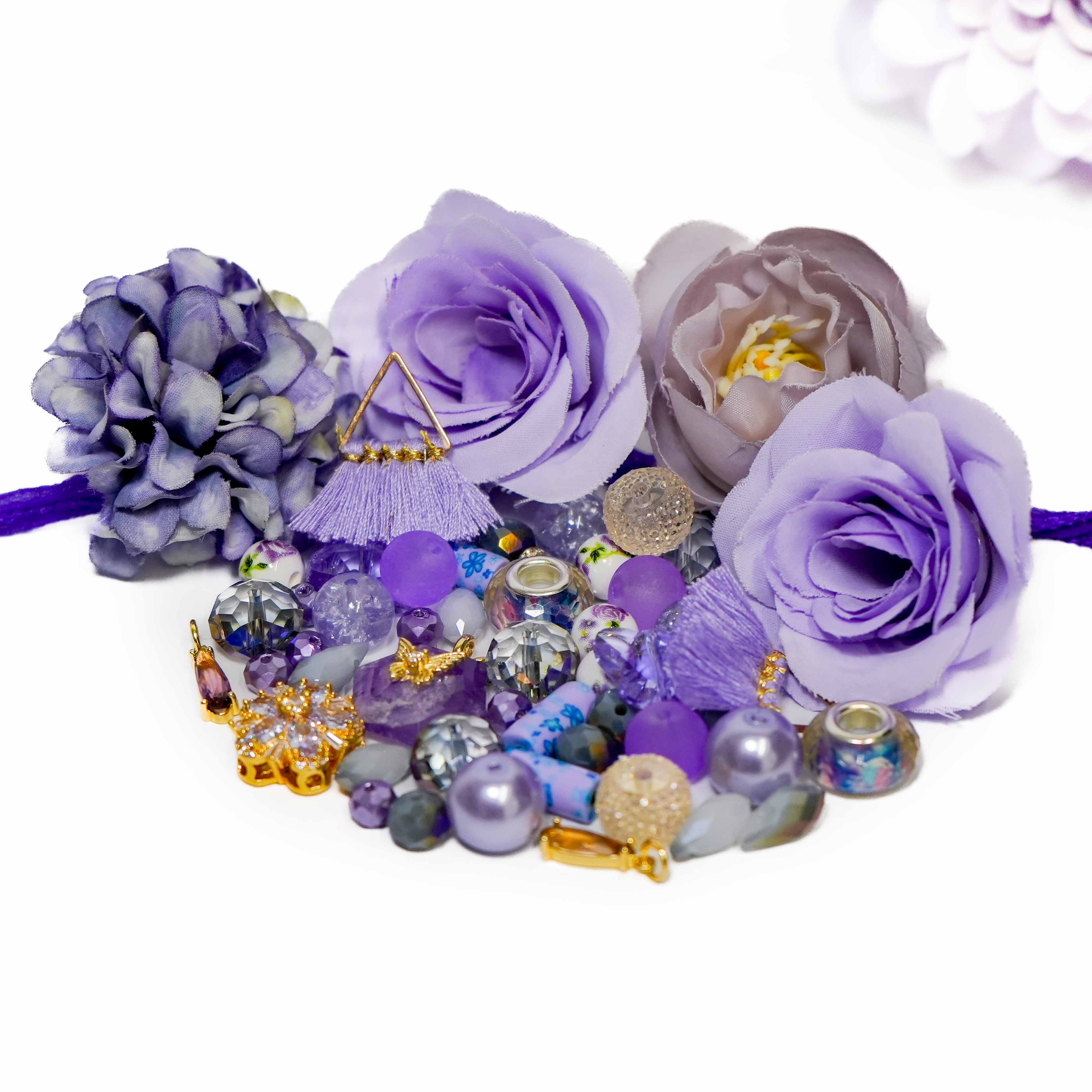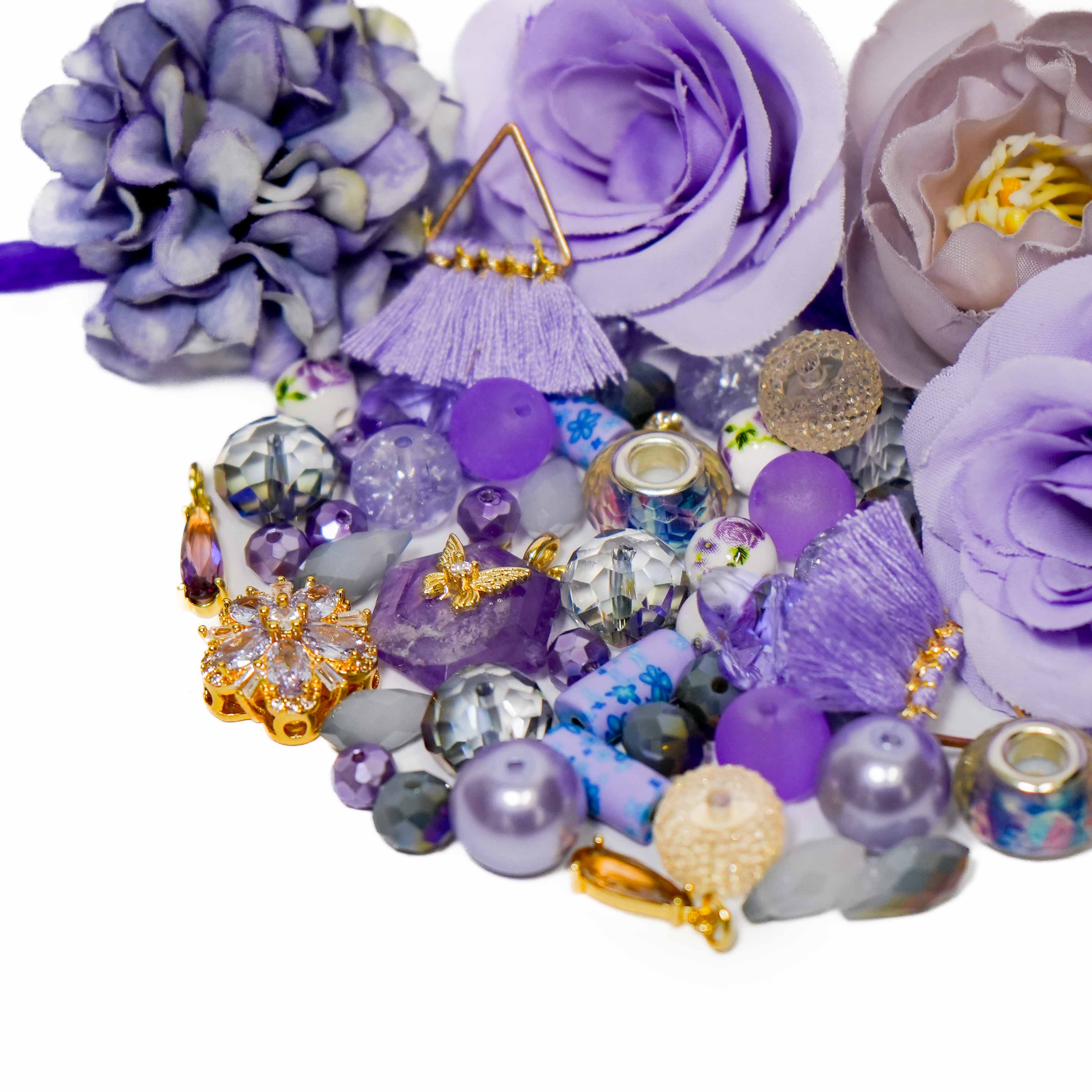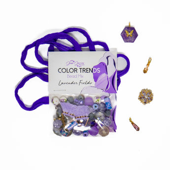 This stunning bundle of beads features a charm set featuring a natural Amethyst stone charm, cubic zirconia flower charm, and glass teardrop charms. These charms are paired with a Color Trends Bead Mix in Lavender Fields, and a custom dyed length of Fairy Silk in stunning Amethyst purple.