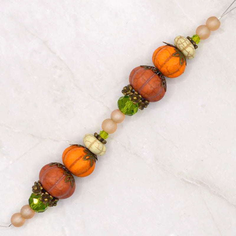 This adorable mini bead strand features stunning custom-dyed Howlite pumpkin beads paired with faceted glass, glass pearls, mini glass rondelles, and antique gold spacers and bead caps. Mini 5-inch bead strand. Largest bead measures 17mm x 12mm. Smallest bead measures 4mm.