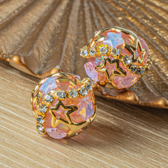Nebulas await your creative mind with these adorable pink colored boho beads. These adorable 18mm boho beads feature stunning gold metal-plated stars and rhinestone accents. Each bead features a clay base adorned with sparkling space-themed embellishments. Sold in pairs. Perfect for wire-wrapping, earrings, bracelets, and more!