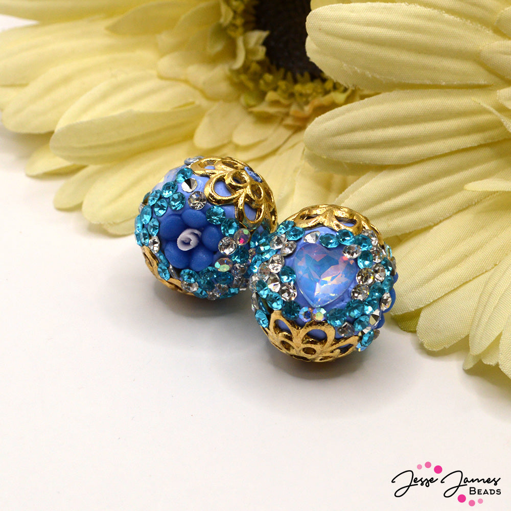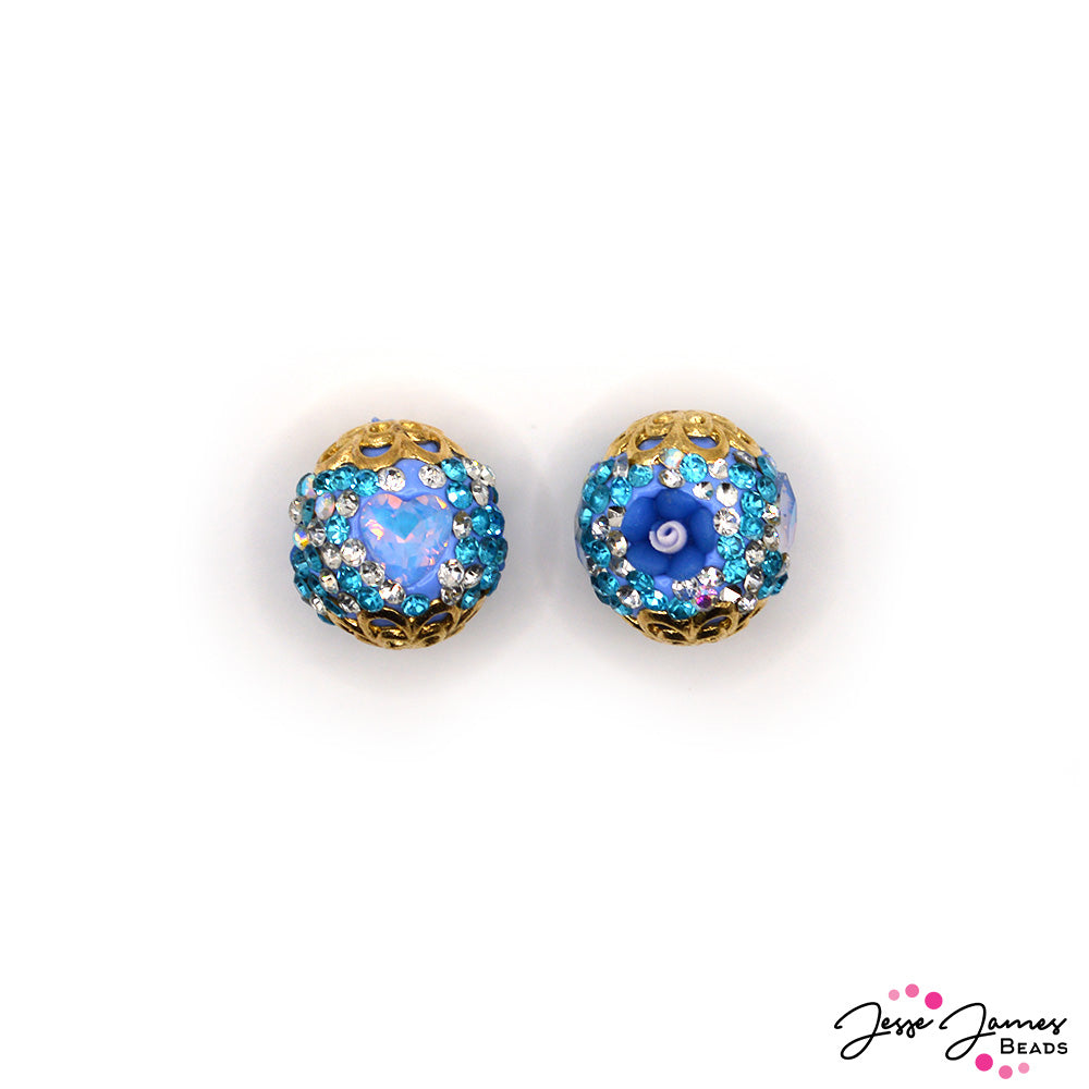 These sparkling snow-inspired boho beads feature a blend of blue and white rhinestone to bring the excitment of fresh snow to life. Each bead features glass hearts and gold-plated metal bead caps. Beads sold in sets of 2. Each bead measures 20.5mm x 19.5mm. Hole size is 2mm.
