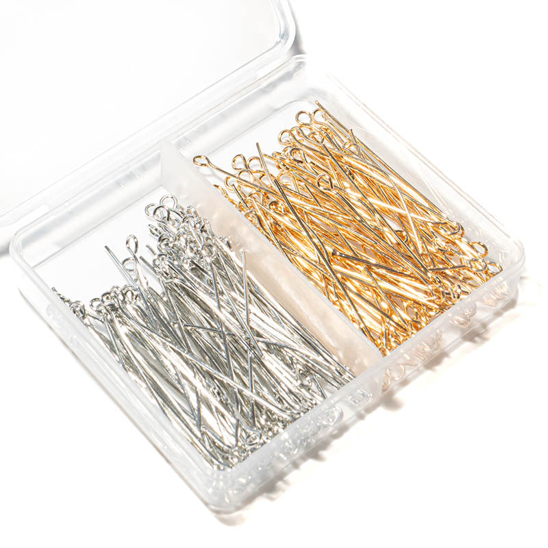 Build secure, professional connections in your jewelry designs with this set of 180 iron eye pins in two classic finishes. Featuring platinum and light gold tones with about 90 pieces per color, these eye pins are cadmium-free and lead-free, making them a reliable choice for everyday jewelry making. Each pin measures 40mm long and 0.7mm thick, offering strength and flexibility for wrapping beads, charms, and drops, while the 2mm eye loop allows for easy linking to chains, jump rings, and findings. Ideal for earrings, necklaces, and layered designs, this essential assortment delivers durability, versatility, and clean, polished results.