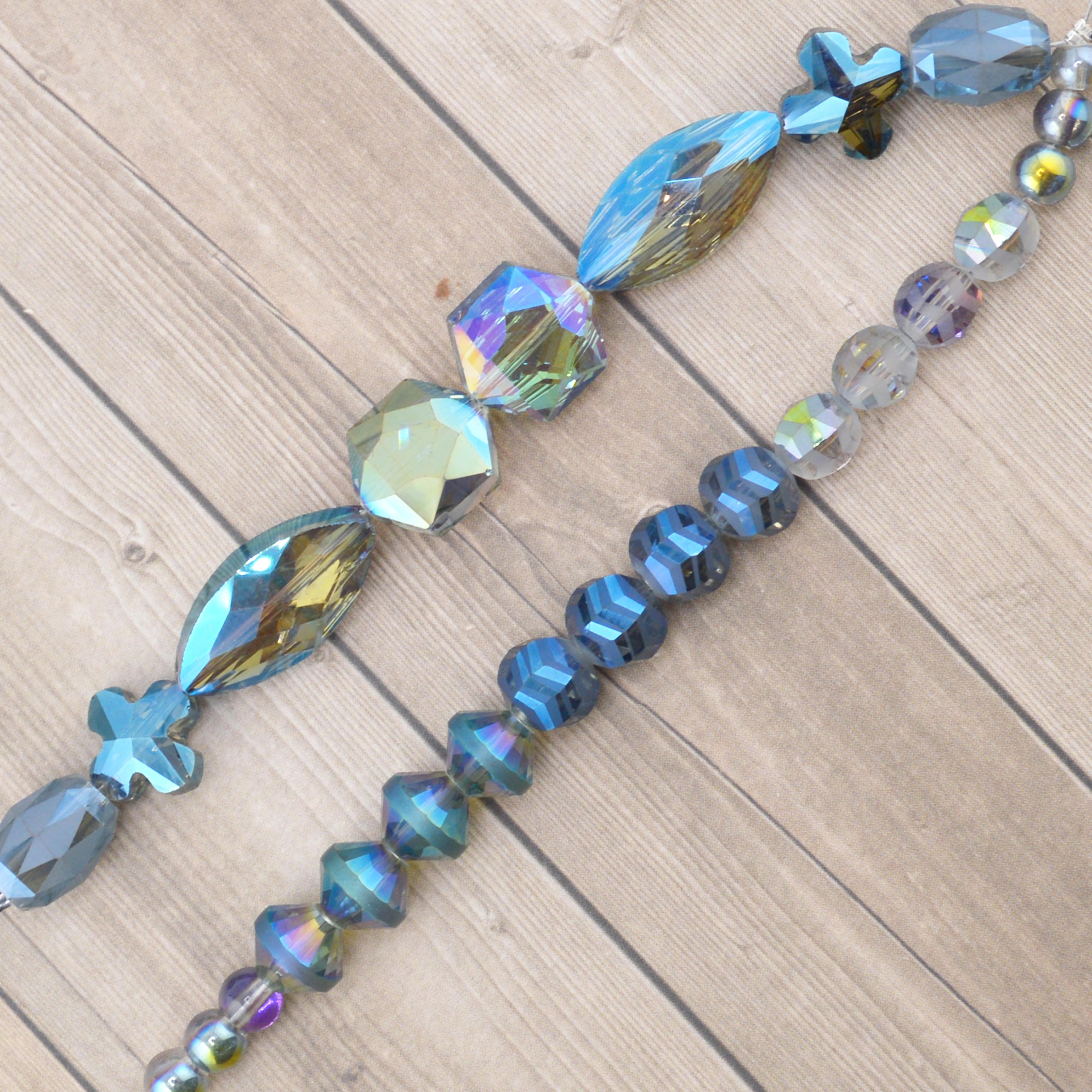 This duo of 5-inch bead strands features an array of stunning blue glass beads. Each strand includes faceted glass shapes including hexagons and ovals paired with faceted glass galaxy rondelles and rounds. Largest bead in set measures 25mm x 12mm x 75mm. Smallest bead measures 6.5mm.
