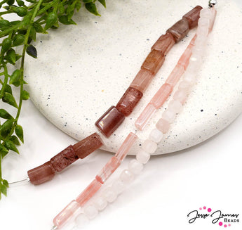 This sweet trio of 5-inch bead strands features a strand of 10 Cherry Quartz 4mm x 13mm tubes, a strand of 24 Rose Quartz 6mm beads and a strand of 10 Strawberry Quartz 12mm x 8mm beads. This trio of beads is perfect for creating jewelry sets, bracelets, earrings, and more.