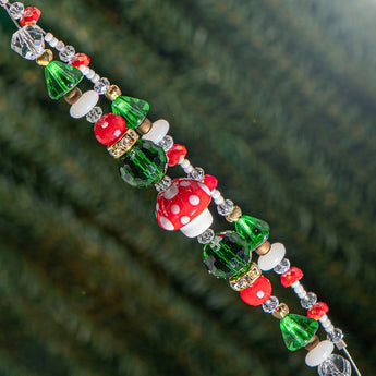 This adorable 4 inch bead strand duo features adorable mushroom lampwork beads paired with faceted glass galaxy rondelles, faceted glass rondelles, glass seed beads, glass heishi and gold plated brass metal bead spacers. Largest bead in set measures 14mm x 14.5mm. Smallest bead in set measures 2mm.