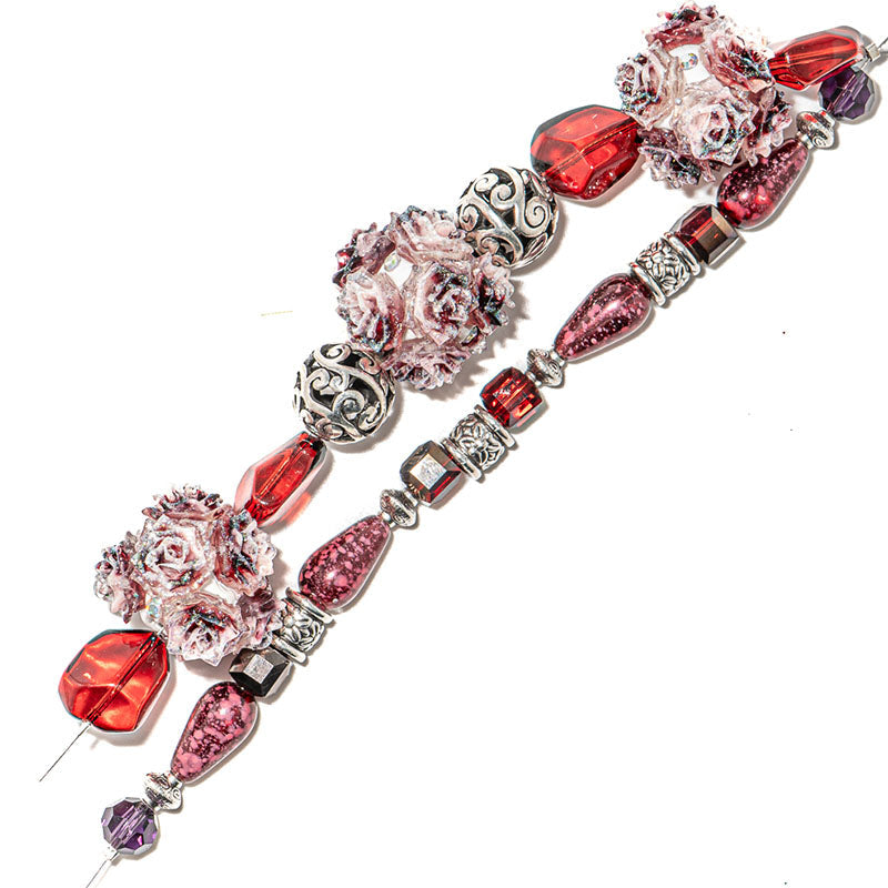 This rich red duo of 5.5-inch bead strands features three bold clay boho beads with resin rose and rhinestone embellishments. These bold bohos are paired with pressed glass shapes, faceted glass cubes, mini faceted glass rondelles, silver-plated brass metal round beads, splatter-dyed glass teardrops, and silver-plated alloy metal bead spacers. Largest bead measures 25mm. Smallest bead measures 6mm.