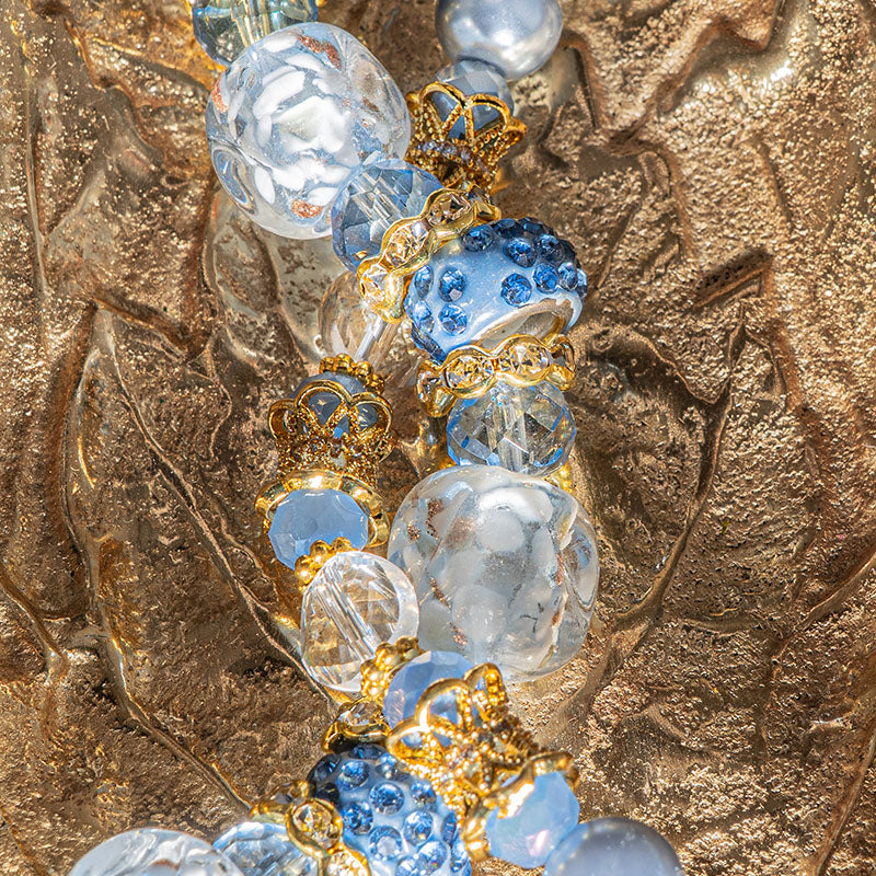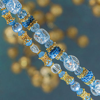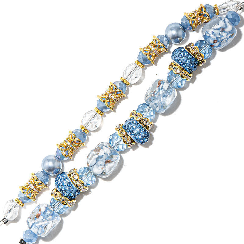This adorable duo of 4-inch bead strands features a playful cool blue color. Each set includes adorable lampwork beads, faceted glass rondelles, faceted glass pearls, icy faceted glass coins, and bright gold-plated brass metal accents. Largest bead in set measures 12mm x 10mm. Smallest bead measures 4mm x 2mm.