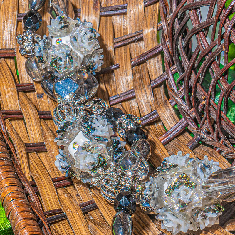 This dark and dreamy duo of 5-inch bead strands features a trio of clay boho beads encrusted with resin flowers paired with faceted glass cubes, organic faceted glass focals, silver-plated brass metal round beads, rhinestone round beads, glass coins, and silver-plated brass metal bead spacers. Largest bead in set measures 25mm. Smallest bead in set measures 10mm x 2mm.
