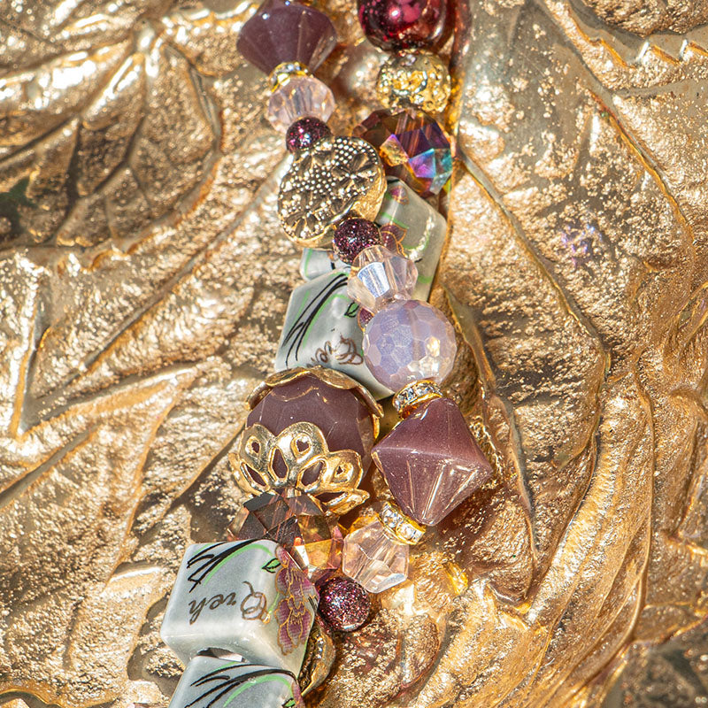 These rich purple 6-inch bead strands feature an alluring blend of purple and teal color. Each strand features printed ceramic cubes, glass bicones, faceted glass bicones, mini acrylic sparkle beads, faceted glass rondelles, galaxy glass rondelles, and gold-plated brass floral coins. The largest piece in this set is 12mm. Smallest bead in set measures 4mm.