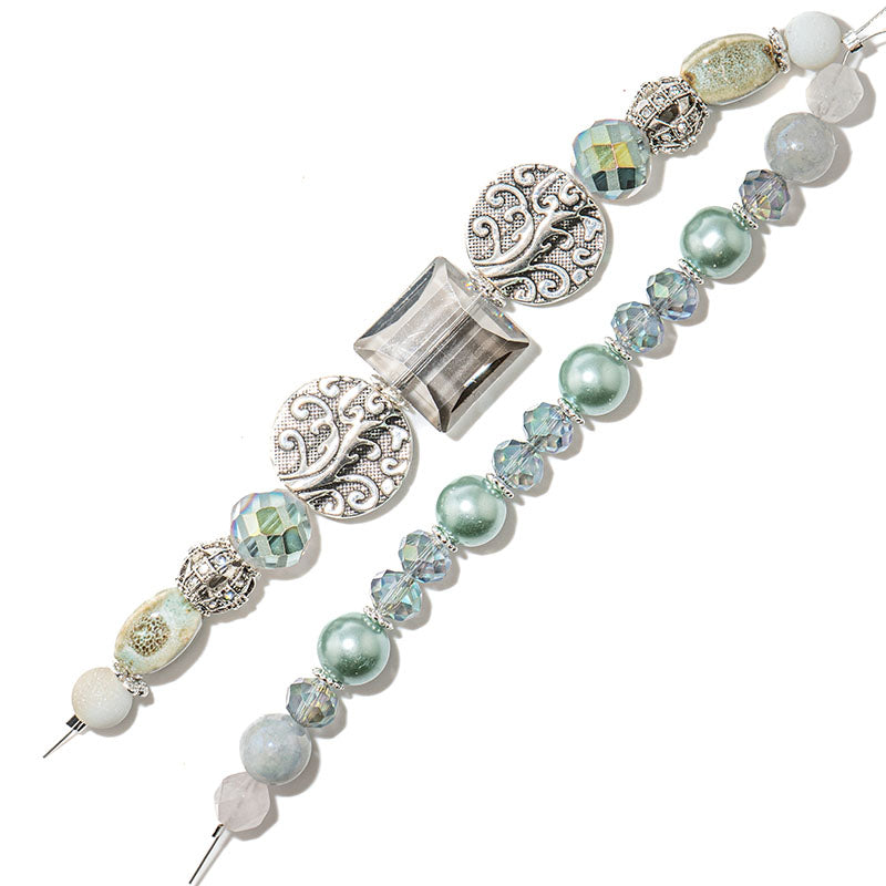 This playful light sage green bead strand features a blend of creamy white, sage green, and sparkling silver. Perfect for earrings, bracelets, and more, this duo of 5 inch bead strands features glass pearls, faceted glass rondelles, faceted glass square focal bead, silver-plated brass metal floral coins, galaxy glass rondelles, ceramic beads, and silver-plated brass rhinestone beads. Largest bead in set measures 18mm x 18mm x 9mm.