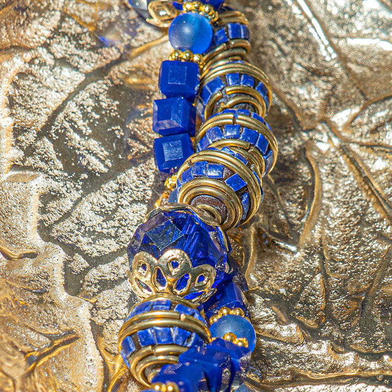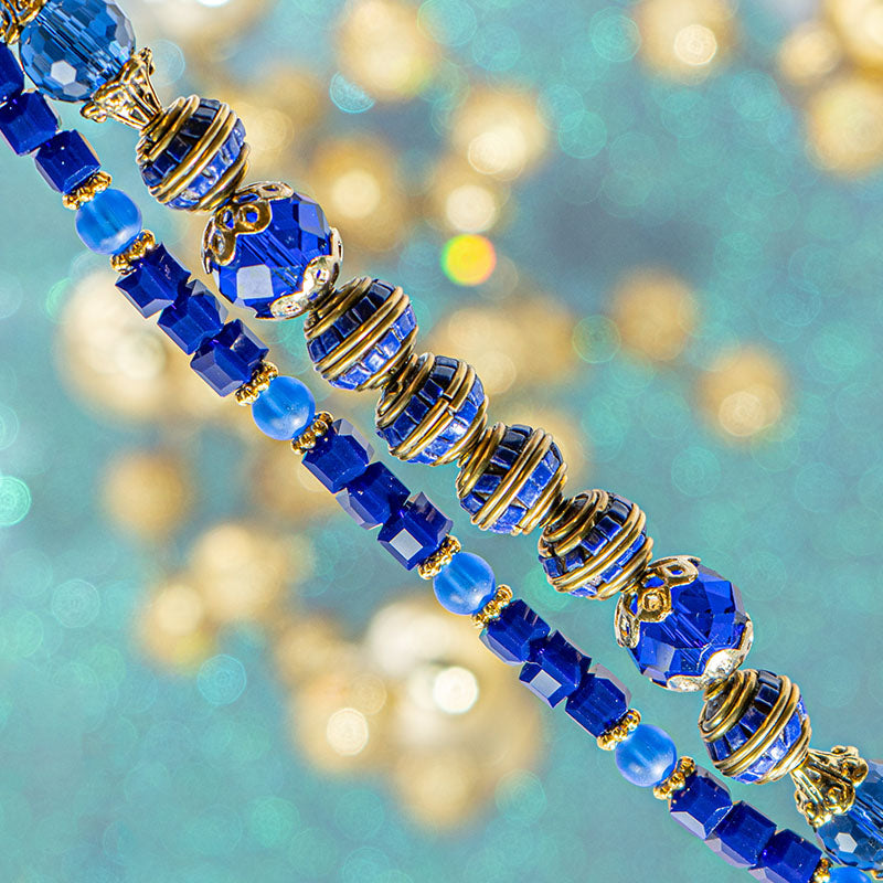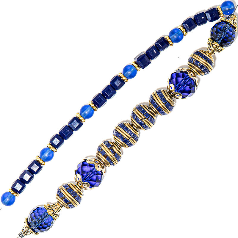 Dive into the deep blue sea with this duo of 5-inch bead strands. Each strand features gold-plated brass and blue Tibetain beads paired with faceted glass rondelles, faceted glass cubes, glass rounds, and gold-plated brass metal bead caps. The largest bead in the set measures 14mm x 12mm. Smallest bead measures 4mm x 2mm.