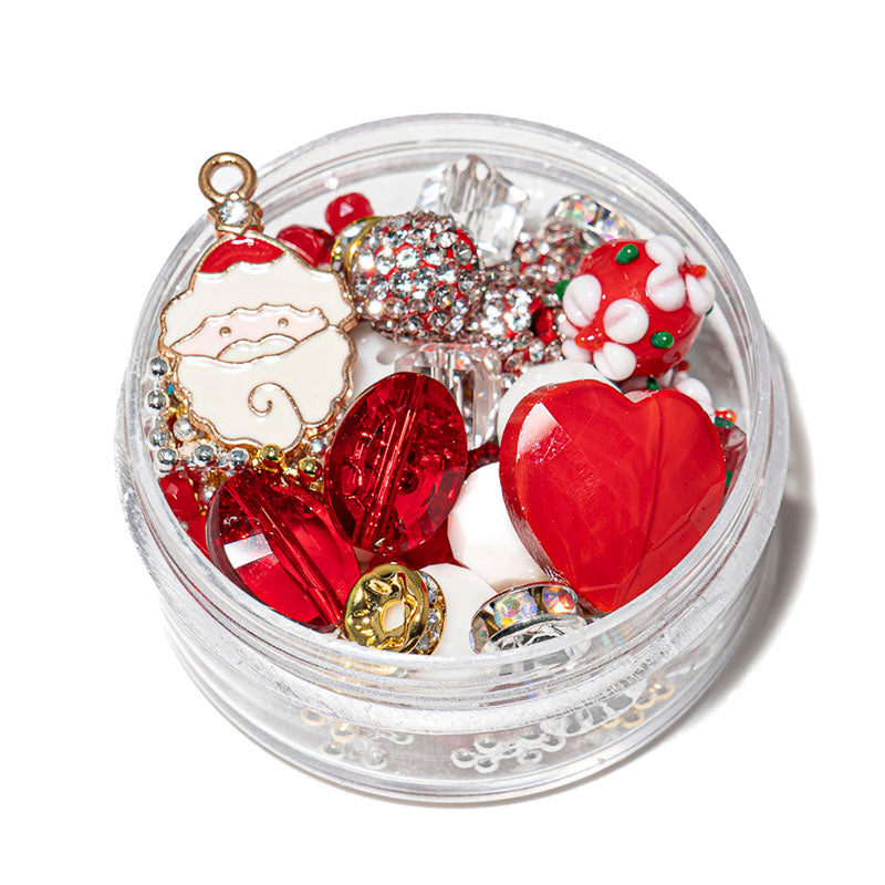 Add a little candy cane sweetnest to your next jewelry project with this adorable red and white bead mix. Each mix includes a blend of enamel charms, faceted glass hearts, lampwork glass floral beads, mini rhinestone encrusted boho beads, rhinestone spacers, faceted glass rondelles, faceted glass cubes, gold-plated brass metal bead spacers, silver-plated brass metal spacers, rhinestone spacers, and faceted glass galaxy rondelles. Largest bead in mix measures 16mm x 16mm x 8mm. Smallest bead in mix measures 6mm x 2mm.