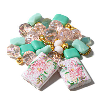 This playful bead mix features floral printed beads paired with pink and teal faceted glass accents.