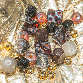 This rich volcanic-inspired bead mix features stunning elements for bold jewelry creation. Each mix includes 4 Czech Fire Polish Cut and Engraved Window beads. These beads are accented by a blend of glass rondelle shapes, gold metal spacers, and gold metal beads. The largest beads measure 10mm, and the smallest beads measure 4mm x 2mm.