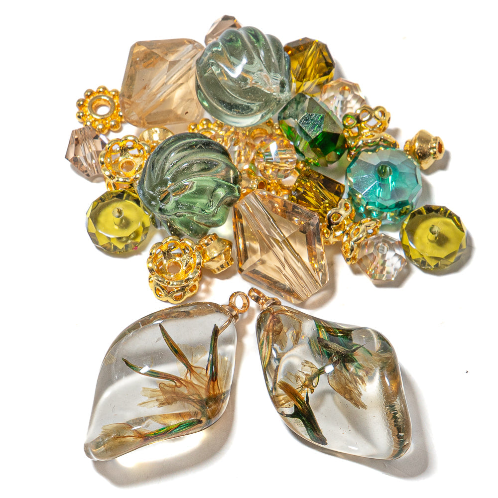 This bead mix features a duo of resin floral beads accented by faceted glass beads in beautiful sage green hues and gold metal bead spacers.